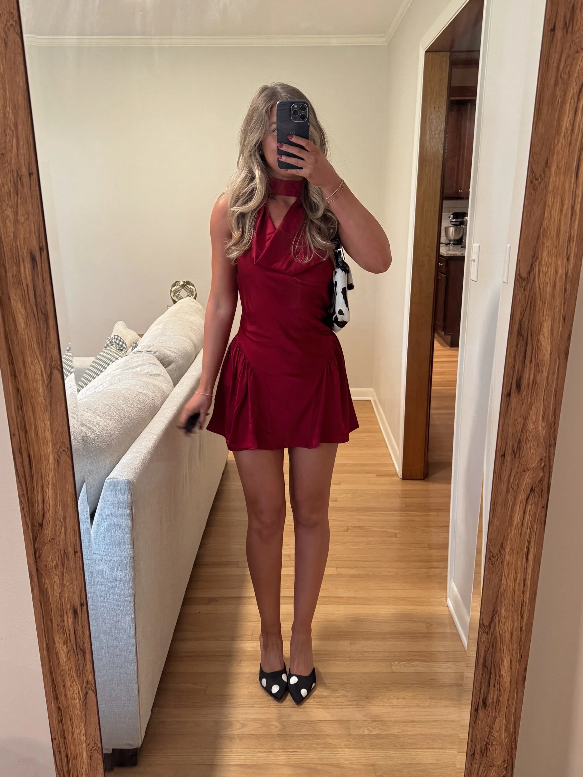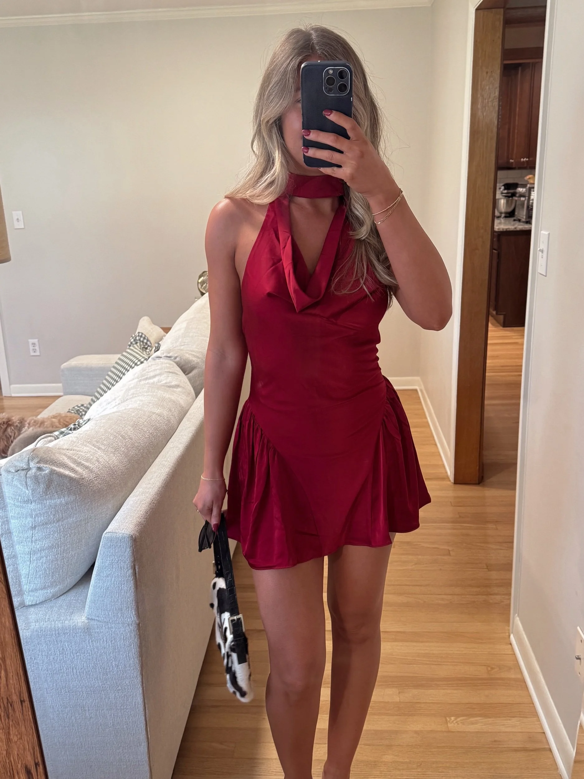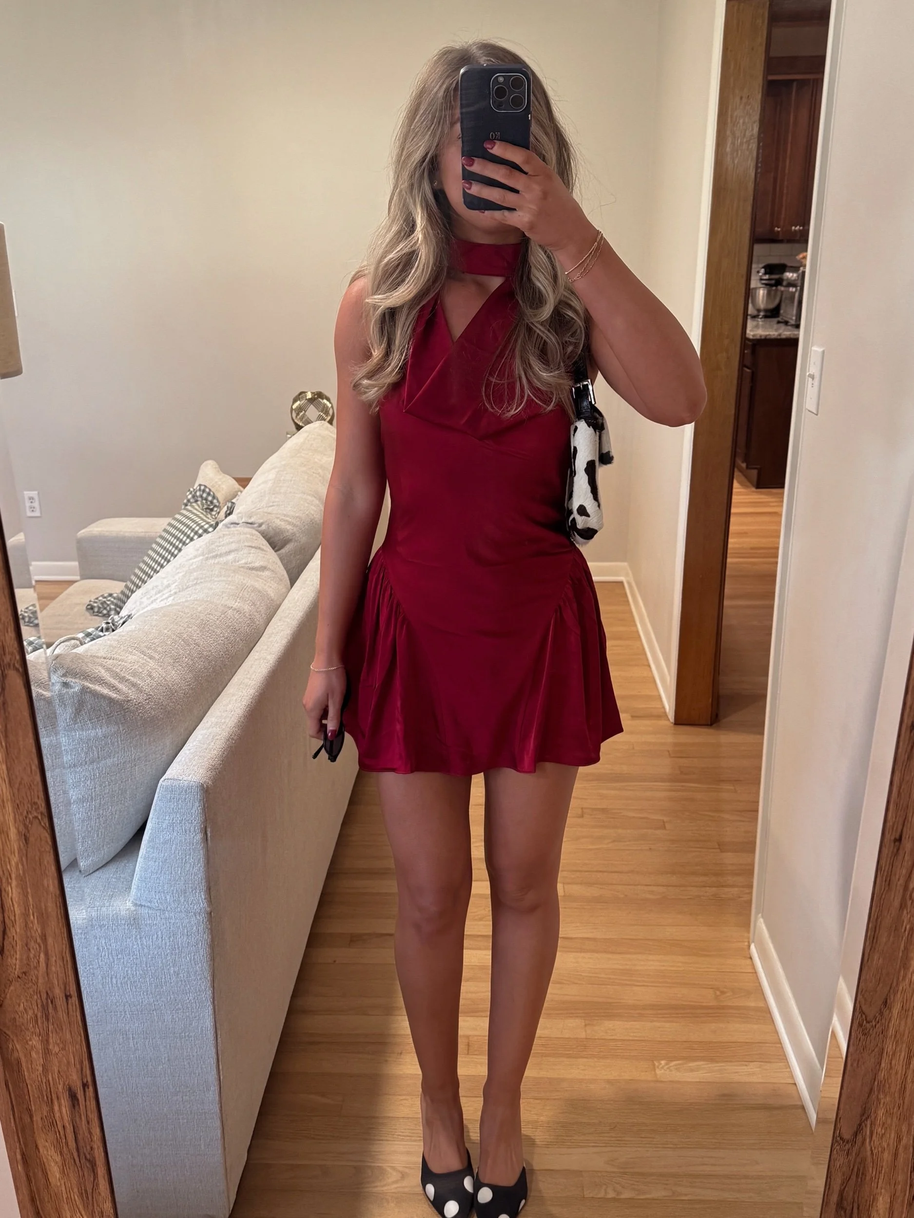 burgundy satin high neck mini dress