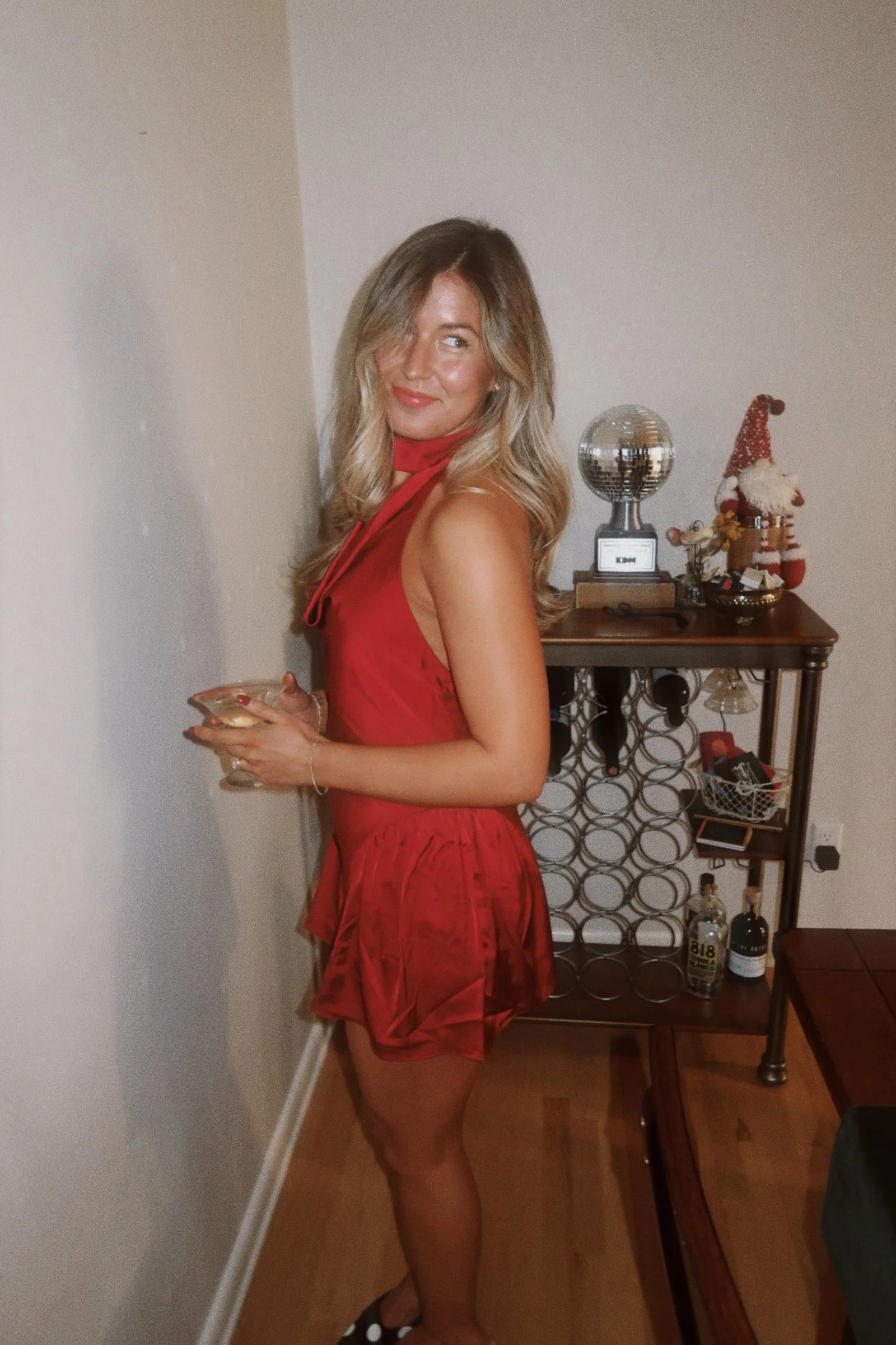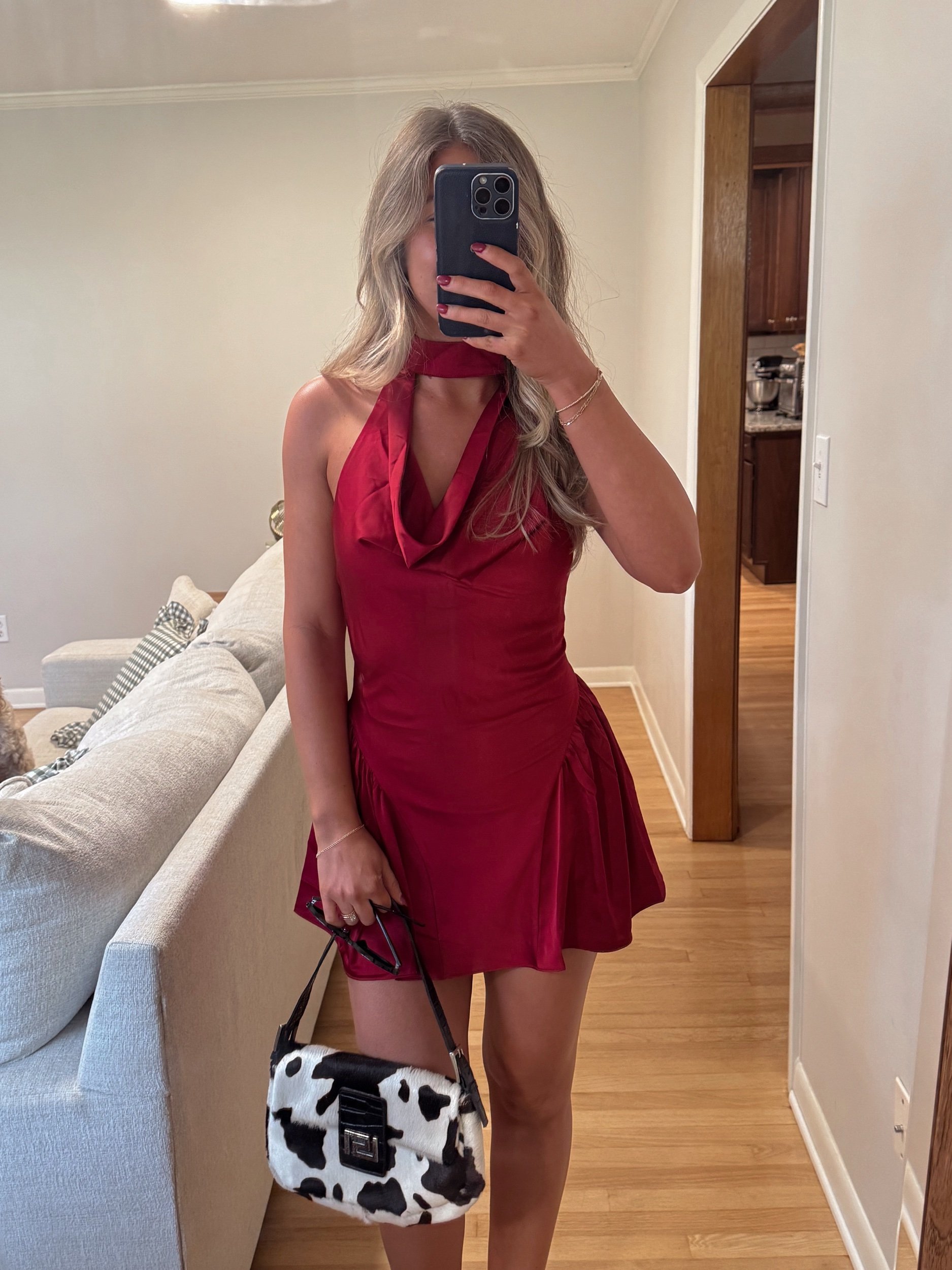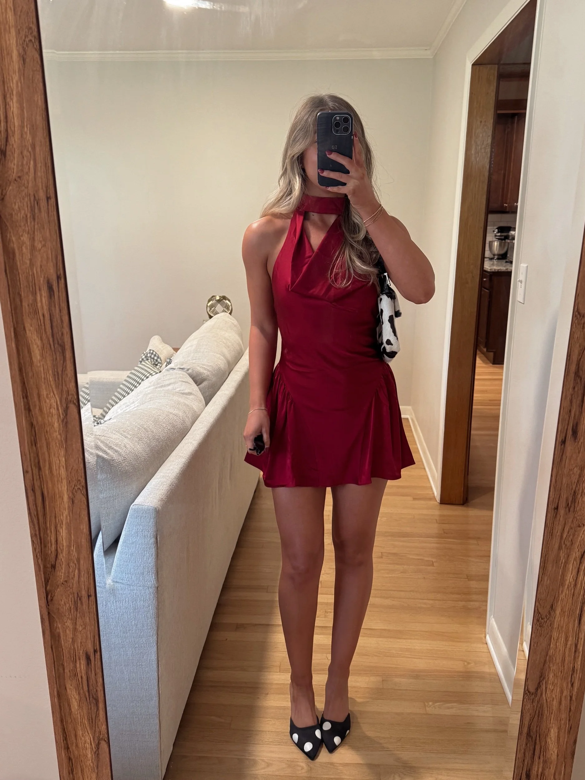 burgundy satin high neck mini dress