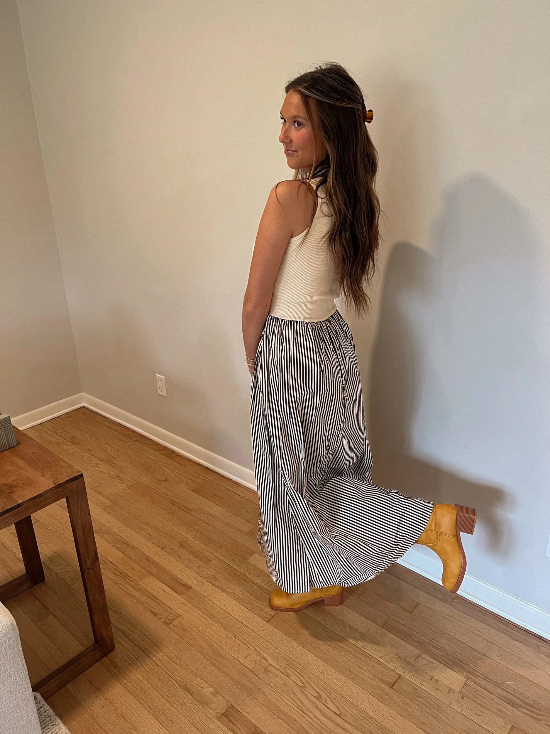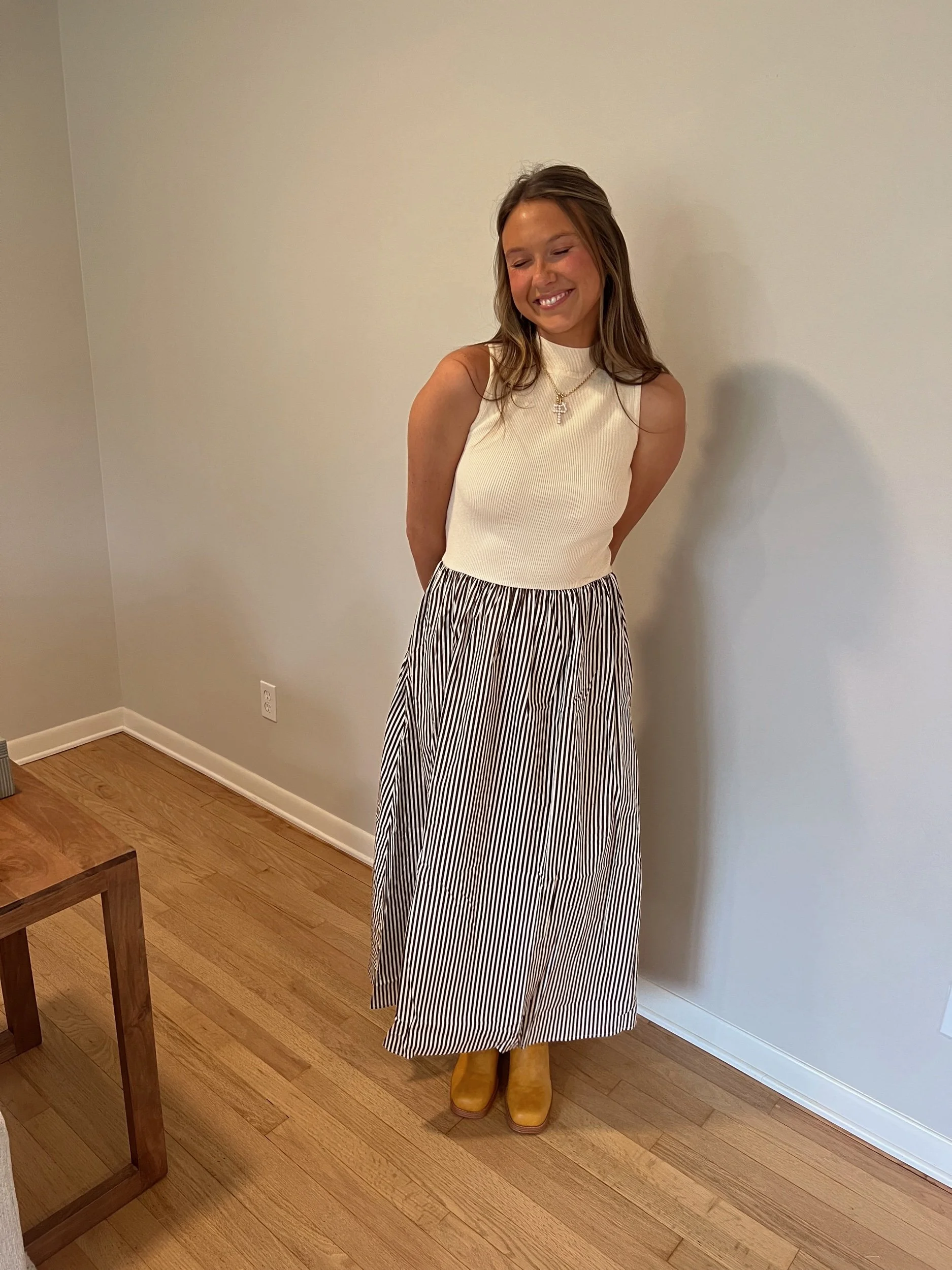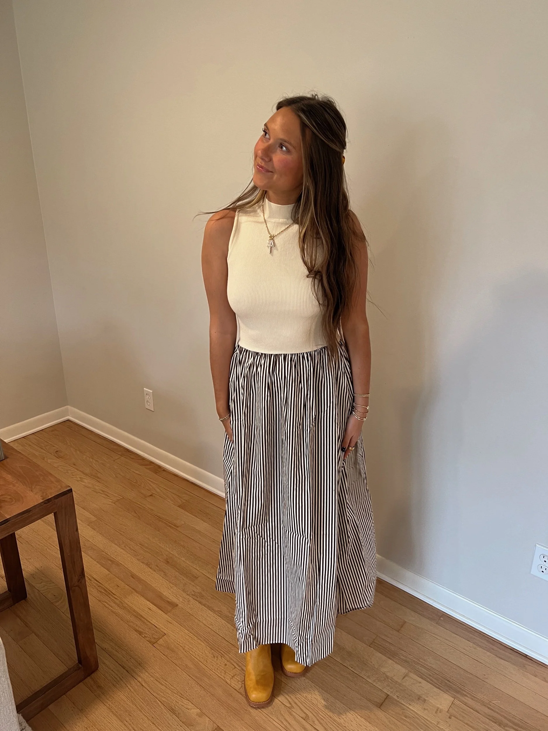- sweater and striped midi / maxi dress