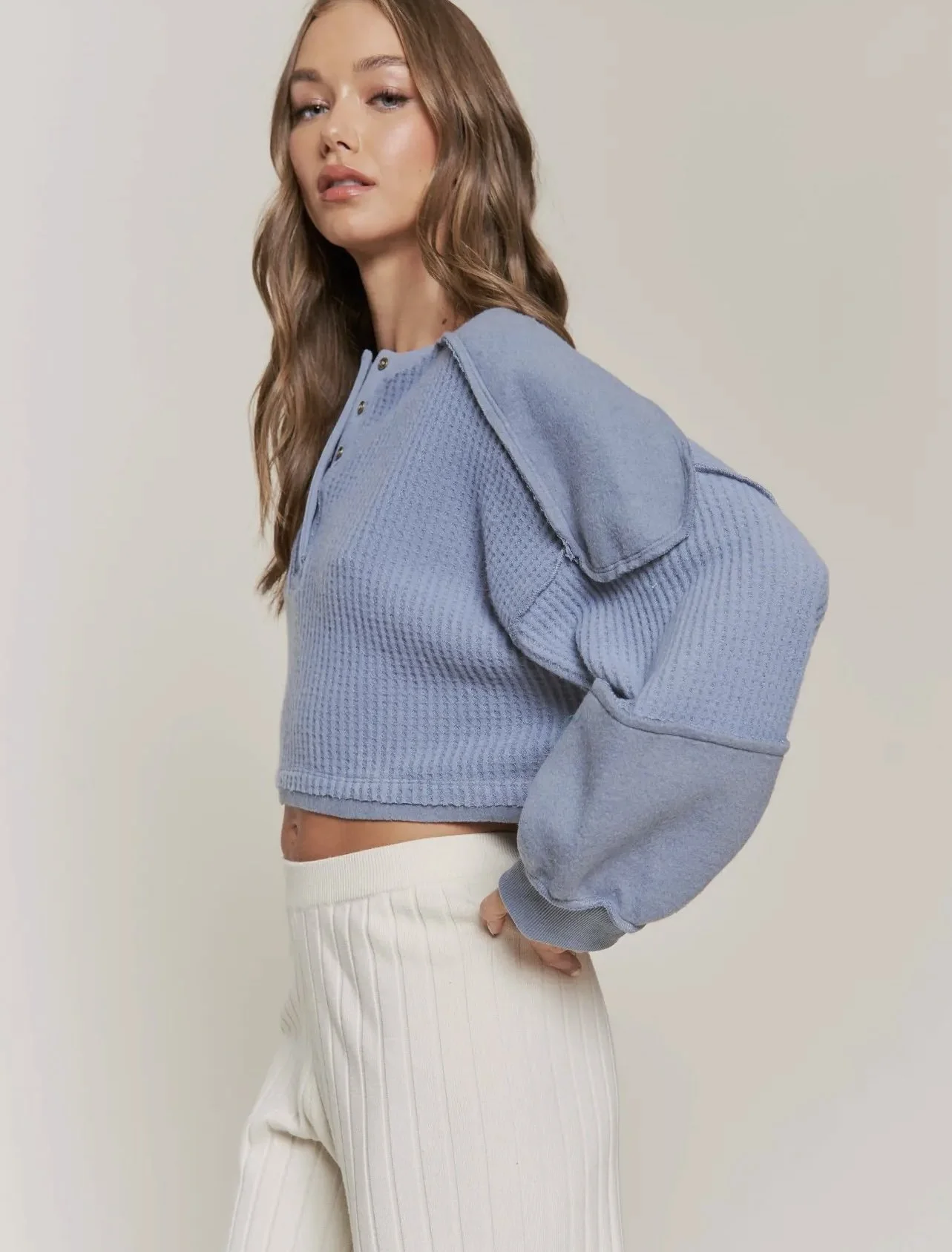 the coziest waffle knit quarter button down top