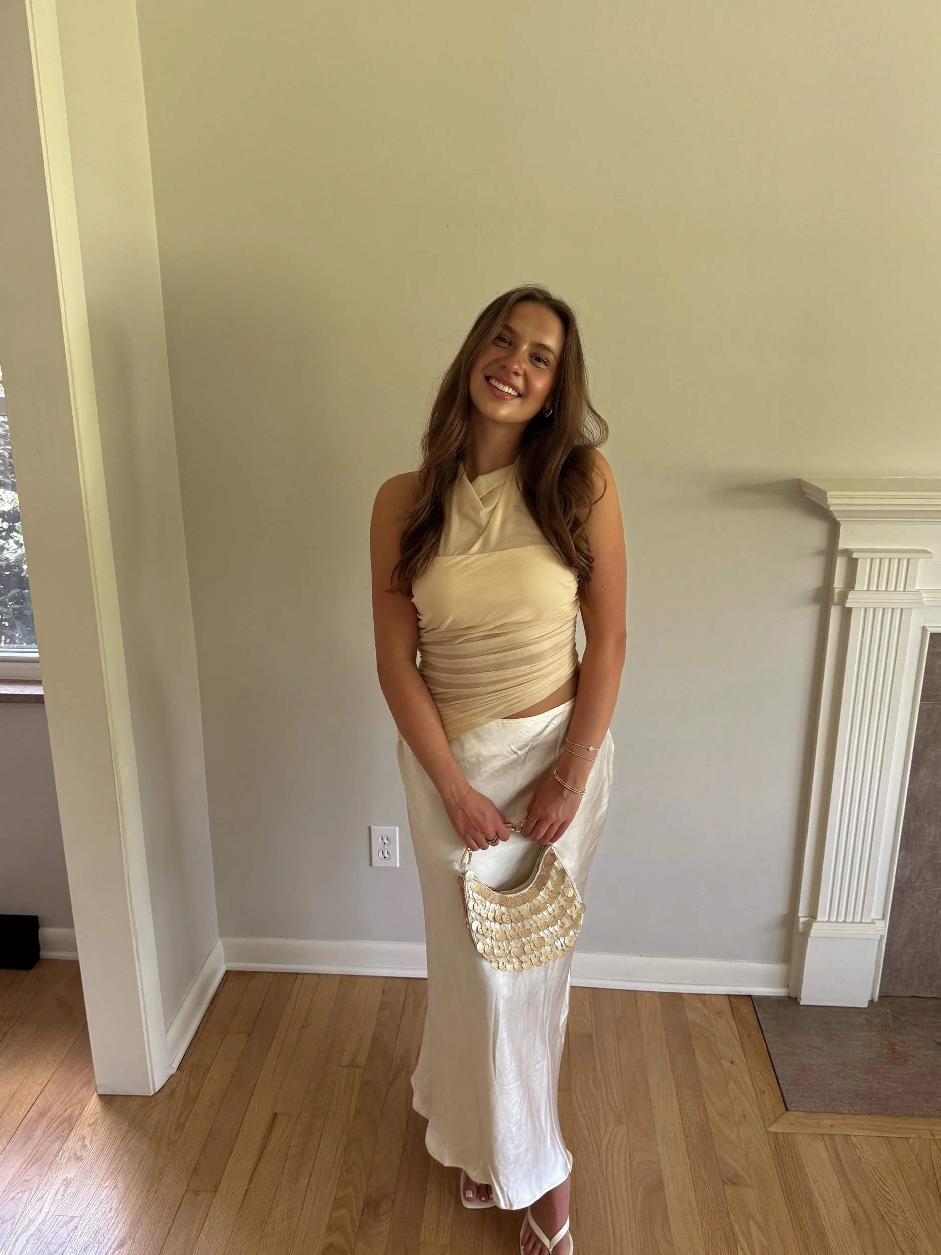 white and cream satin and mesh midi dress